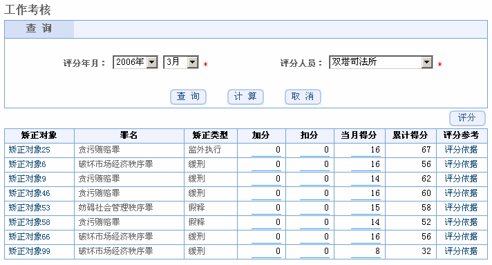 | 每月月底进行统一的工作考核,以矫正对象平时表现为评分依据,对矫正对象进行加分和扣分, 自动为矫正对象评定当月得分、累计得分。 |